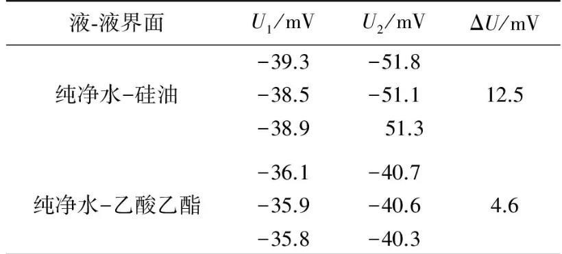 实验测量所用金属吊环的外径、内径分别为0.034 96 m和0.033 10 m.在20℃实验条件下,采用自制2种液体间界面张力的动态实时测量仪,测量了纯净水-硅油和纯净水-乙酸乙酯间的界面张力.测量出金属吊环由液体I中完全进入液体Ⅱ的过程中,液体I的液膜被拉断前电压的最大值U1,拉断后趋于稳定时的电压值为U2,数据结果如表1所示.