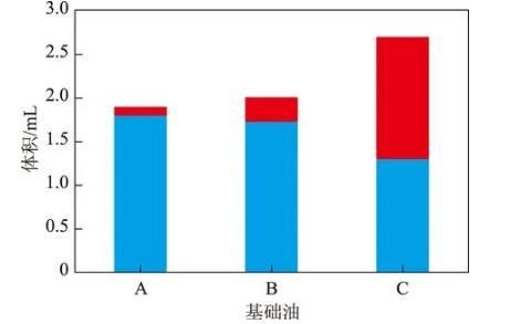 由图1可以看出:未加复合剂时不同基础油的分水效果不同,基础油A和基础油B的分水效果较好,水在离心作用下全部分出;基础油C的极性物质含量高,亲水性强,分水能力差,因此出现了乳化层。