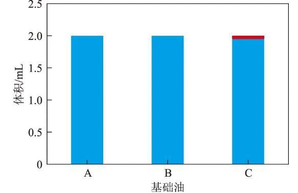 一般情况下,界面活性由小到大的顺序为:饱和烃<芳烃<胶质。重芳烃及胶质组分中的极性物质具有较强的界面活性,它们的存在可以降低油品与水的界面张力,使油品容易乳化。且复合剂的加入进一步降低了油水的界面张力,导致油品乳状液稳定性增强,其分水性变差。加入的复合剂可能与油品中所含芳烃和胶质等极性化合物结合,导致基础油分水性更差。所以基础油中所含极性组分越多,其与加入的复合剂结合的程度就越强,导致基础油的分水性越差。结合表1进行分析可知:基础油A的黏度最小,且芳烃和胶质等极性化合物含量最少,其分水性最好;基础油C的黏度最大,且芳烃和胶质等极性化合物含量最高,其分水性最差;基础油B的黏度和极性组分含量比A大、比C小,其分水性能介于A与C之间。