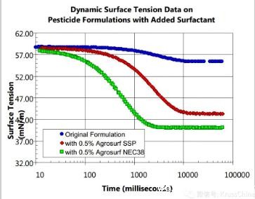 每种配方的初始接触角大约为90°,原始配方平衡接触角为86°,添加了Agrosurf SSP后的农药,平衡接触角降到61°,而添加了Agrosurf NEC38后,接触角降低更快,平衡后为54°。