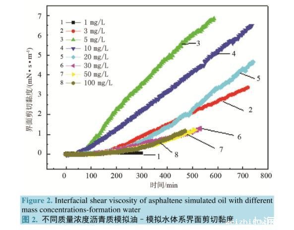 图2.不同质量浓度沥青质模拟油–模拟水体系界面剪切黏度