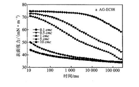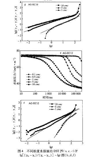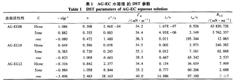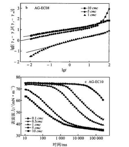 在25cc下测定不同浓度AG.EC水溶液的DST,并利用Rosen模型处理,得到其动态表面张力参数,见图4、表1。