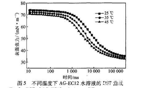 由图5可知,当温度升高,DST下降的速率明显加快。这是因为分子的不规则运动更加激烈,使得分子间的引力减小。表面张力越早开始下降,在各个阶段的表面张力值就越低。在45℃下开始测量时,表面张力已经降到了70mN/m左右,这也许是由于温度升高降低了纯溶剂水的表面张力。升高温度,表面张力下降的更快,更易达到第四个阶段平衡状态。这说明了高温下其动态表面活性更好。可能是由于表面活化能在高温时更低,使得AG.EC分子更易在溶液表面吸附。