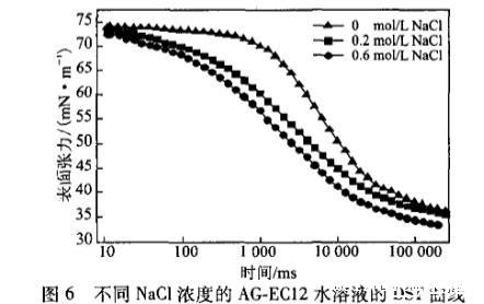 平衡张力研究表明,三种烷基糖苷柠檬酸单酯盐在其各自的水溶液中均具有表面活性。动态表面张力研究表明,同摩尔浓度AG—EC08、AG.ECIO和AG—EC12水溶液的动态表面活性在达到一定时间后随表面活性剂分子的疏水链增长而不断增大;AG—EC溶液的浓度越高,其动态表面活性越好,DST越快平衡,DST曲线越低。而当温度升高,其DST明显下降;无机电解质NaC1对其DST的影响也较明显,随着NaC1浓度增大,其DST曲线越低。