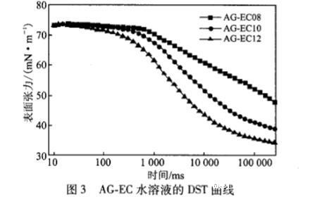 由图3可知,对于不同链长的AG.EC水溶液,其DST曲线都是微微下降一快速下降一缓慢平衡的过程。另外在疏水链变长的同时,DST曲线的诱导期时间缩短,DST下降趋势增加,介平衡状态表面张力值越低。这是由于疏水烷基链增长使得表面活性剂的疏水性增强,更容易吸附到溶液的表面。
