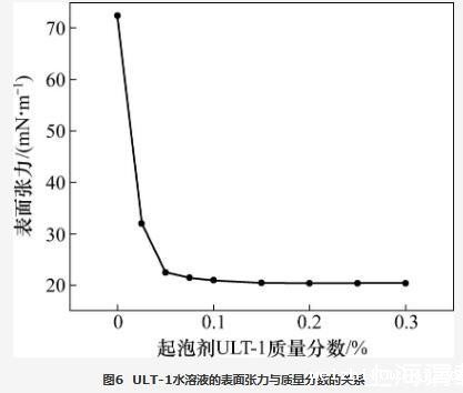 当起泡条件相同时,起泡剂水溶液的表面张力越低,发泡体积越高。配制一系列浓度梯度的起泡剂ULT-1水溶液,利用接触角/表面张力测量仪采用悬滴法测量表面张力与起泡剂ULT-1质量分数的关系,结果如图6所示。从图6可知:当起泡剂ULT-1质量分数小于0.05%时,表面张力随起泡剂ULT-1质量分数的提高快速降低;当起泡剂ULT-1质量分数大于0.05%时,表面张力降幅越来越小;当起泡剂ULT-1质量分数提高至0.2%时,表面张力降至20.40 mN/m,较蒸馏水降低了71.82%,继续提高起泡剂ULT-1的质量分数,表面张力不再降低。表明新型起泡剂ULT-1在较低浓度时即达到较低的表面张力,有利于提高发泡体积。