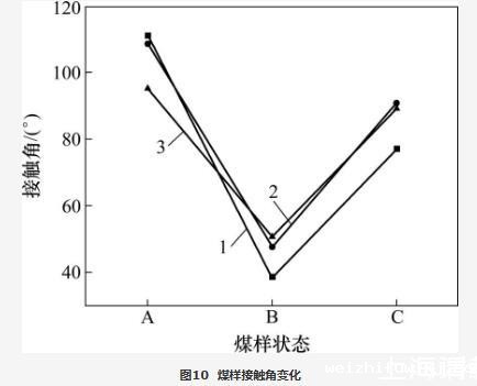 煤样润湿性变化主要反映了起泡剂在煤样表面的吸附与脱附情况,可以根据接触角θ判断润湿性情况。通常把θ=90°作为是否润湿的界限,θ>90°表明不润湿,θ<90°表明润湿,θ越小,润湿性能越好。分别取滇东黔西地区的松河15号煤样、恩洪16号煤样和天井8号煤样,利用接触角/表面张力测量仪通过五点拟合法分别测量纯水在原始煤样(A状态)、0.2%起泡剂ULT-1溶液浸泡1 h烘干的煤样(B状态)、0.2%起泡剂ULT-1溶液浸泡1 h后低速水流冲洗1 h烘干的煤样(C状态)表面的接触角,结果如图10所示。将C状态接触角与B状态接触角的差值定义为接触角增加值,C状态接触角与A状态接触角的比值定义为润湿性恢复值,间接反映了新型起泡剂ULT-1在煤样表面的脱附程度,润湿性恢复值越大,越易脱附,脱附程度越大。原始煤样接触角均大于90°,为水不润湿(A状态),起泡剂ULT-1在煤样表面吸附后接触角均小于90°,将煤样表面变为中度润湿(B状态),但是低速水流冲洗吸附了起泡剂ULT-1的煤样1 h后,接触角均明显增大,松河15号与天井8号煤样的接触角增加38°以上,接近90°,变为弱润湿(C状态),恩洪16号煤样的接触角增加43°以上,超过90°,变为不润湿(C状态)。各煤样润湿性恢复值均超过69%,天井8号润湿性恢复值最高达到93.70%,表明新型起泡剂ULT-1在煤层气排液开采过程中易于脱附,有利于储层保护。