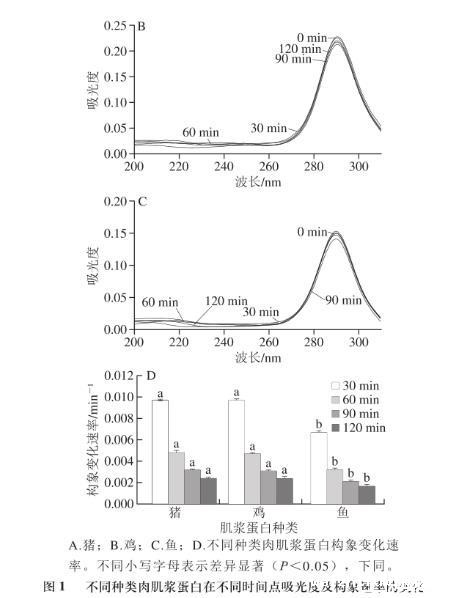 图1不同种类肉肌浆蛋白在不同时间点吸光度及构象速率的变化