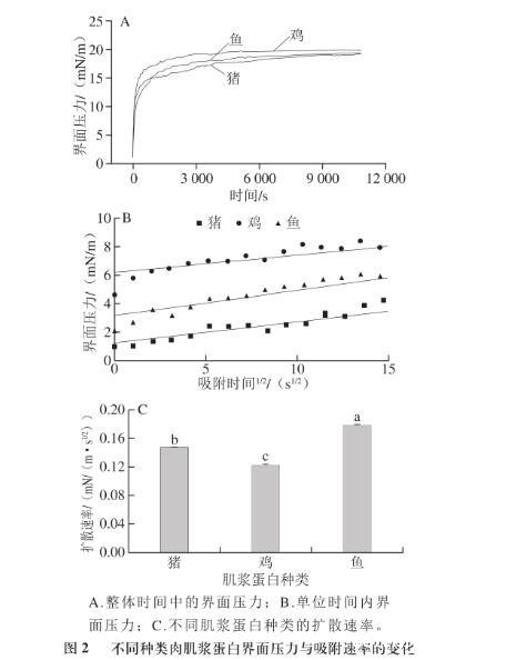 肌浆蛋白的吸附动力学实验表明鱼肉肌浆蛋白的扩散速率较猪肉和鸡肉肌浆蛋白间显著较大,这可能是由于大粒径的肌浆蛋白产生的空间位阻在一定程度上削弱了表面疏水性的提高带来的吸附速率的增加,但鸡肉与猪肉肌浆蛋白之间的扩散速率却无显著性差异。