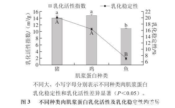 实验结果还表明,鸡肉肌浆蛋白乳化活性最高,鱼肉肌浆蛋白乳化活性显著低于猪肉和鸡肉肌浆蛋白,猪肉肌浆蛋白乳化活性稍低于鸡肉但无显著差异性,这可能是由于肌浆蛋白粒径及构象的不同造成的。但鱼肉肌浆蛋白的乳化稳定性显著最差。