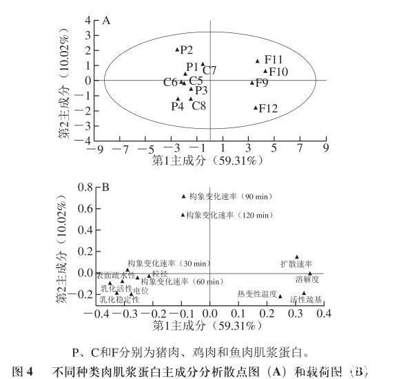 图4不同种类肉肌浆蛋白主成分分析散点图(A)和载荷图(B)