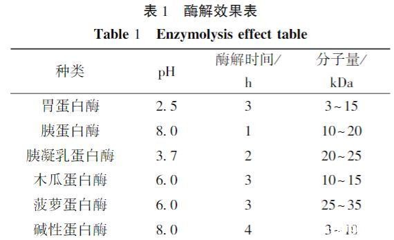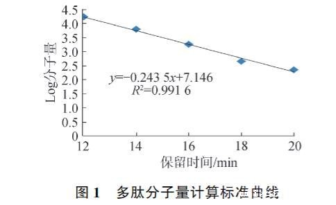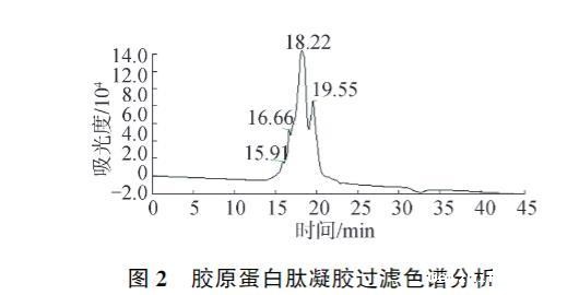 为实现胶原蛋白肽分子量可控均一,分别比较了胃蛋白酶、胰蛋白酶、胰凝乳蛋白酶、木瓜蛋白酶、菠萝蛋白酶、碱性蛋白酶的酶解效果,在酶本身最适pH条件下,酶解至分子量不发生明显变化,检测其酶解后分子量分布(分子量计算依据图1中的标准曲线),结果见表1。从表中结果可以看出不同的酶对胶原蛋白的酶解效果不尽相同,然而均未能达到控制其分子量在200~5 000 Da的预期效果。胰蛋白酶酶解速度最快,1 h酶解结束,而碱性蛋白酶是这几种蛋白酶中酶解后分子量最小的。因此,将这2种最适pH为8.0的蛋白酶混合,经条件优化发现胰蛋白酶。碱性蛋白酶为2:5时,2种酶同时作用可以在1 h内将胶原蛋白酶解至200~5 000 Da(凝胶过滤色谱检测结果见图2)。碱性蛋白酶酶切位点为Ala、Leu、Val、Tyr、Phe、Try,胰蛋白酶酶切位点为Arg、Lys,这2种酶的酶切位点无重叠,从而在酶解过程中协同作用,实现了快速高效酶解。