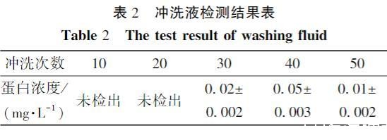 通过用生理盐水对材料进行浸泡、多次冲洗,检测覆层4层羟基磷灰石材料中胶原蛋白肽的泄露,来评价生物覆层材料的稳定性。对收集的浸泡液、冲洗液浓缩100倍,通过微量Lowry法检测其蛋白浓度,在浸泡液中未检出胶原蛋白肽,冲洗液检测结果见表2。从表中结果可以看出随着冲洗次数增多,泄露的胶原蛋白肽呈现先增加后减少的趋势,说明覆层的胶原蛋白肽会有一定的脱落,但不会一直脱落,经折算,脱落胶原蛋白肽总量仅占覆层总量的0.01%,因此制备的覆层材料是稳定可靠的。