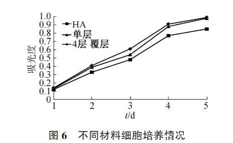 MC3T3-E1细胞在羟基磷灰石和覆层材料上培养5天的增殖情况见图6。因结果类似,图中仅列出了单层和4层覆层材料的增殖结果,可以看出在覆层材料上MC3T3-E1细胞增殖要优于空白羟基磷灰石材料,表明所制覆层材料不仅无细胞毒性,而且因胶原蛋白肽的优良生物相容性,能一定程度上促进细胞增殖。所用的羟基磷灰石和胶原蛋白肽都是经过实践证明的生物相容性良好的材料,其对材料生物性能的提升作用是由其本身的生物相容性良好引起的,因此覆层层数对生物性能提升作用不明显。