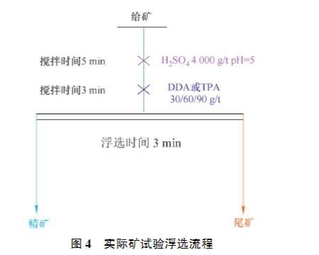 在XFG挂槽浮选机上进行实际矿浮选试验,转速设为1 992 r/min。每次称取250.0 g矿样放入0.5 L浮选槽中,加入0.3 L自来水;综合考量文献调研、纯矿物浮选结果、经济性等方面因素,确定矿浆pH值等于5为较佳的浮选pH条件。使用H₂SO₄作为pH调整剂,调节矿浆pH值为5,搅拌矿浆5 min后,加入一定量的DDA或TPA,搅拌3 min后开始用刮板刮出泡沫产品,每间隔3 s刮1次,浮选刮泡时间为3 min。结束后将得到的泡沫产品和槽内产品分别烘干、称量,测定品位,并计算产率与回收率。实际矿浮选试验流程如图4所示。