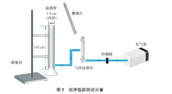 测定泡沫半衰期时,为使半衰期更明显,保持气体流量计流量为1.5 L/min。气体通过泡沫测试管使体系发泡,充气10 s后立即切断电源,并记录泡沫层高度衰减至1/2时所需的时间,即t₁/₂。