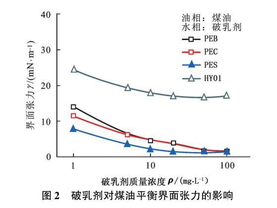 阳离子破乳剂对原油界面张力的影响呈现独特的规律,但其质量浓度低于50 mg·L-1时,界面张力始终处于一个略低于单独1 000 mg·L-1PPG界面张力的平台值,说明此时HY01分子主要与溶液中的PPG分子发生作用,只有少量的HY01与界面上的PPG分子发生作用;但质量浓度达到100 mg·L-1时,HY01分子在界面上与带负电荷的PPG分子混合吸附,造成界面张力明显降低。在较宽的中间质量浓度范围内,界面张力保持不变,意味着此时界面层上HY01分子已经饱和,这与反电荷的聚电解质与表面活性剂相互作用的普遍结果是一致的。