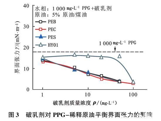 图3破乳剂对PPG-稀释原油平衡界面张力的影响