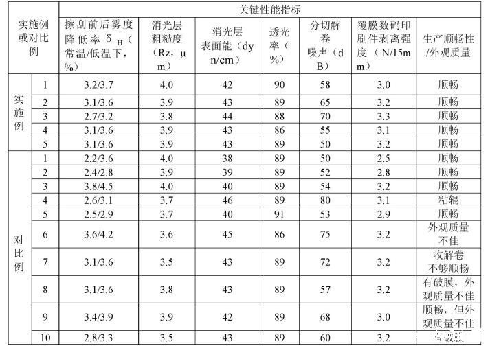 从实施例1~实施例5的数据可知,本发明的耐擦刮无胶消光膜在常温和低温环境下均具有良好的耐擦刮性能,实现了消光层表面在耐擦刮性、高表面张力(与印刷适性正相关)与收解卷顺畅性的平衡。其中实施例4中球体抗粘连剂为球体聚硅氧烷,虽然制得的薄膜的透光率相比实施例2有所下降,但是薄膜的分切解卷噪声降低明显,总体性能是符合本申请要达到的目标的。实施例5中,在热复合层中加入了适宜熔融指数的高密度聚乙烯,其制备的耐擦刮无胶消光膜表现出更低的分切解卷噪声,解卷顺畅性更好,且未对薄膜的透光率和热复合层与印刷件之间的剥离强度产生不良影响。