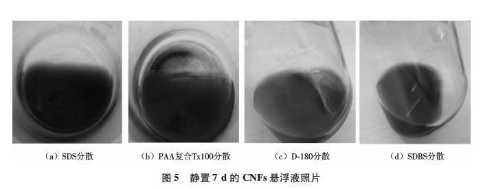 图5为静置7d后4种表面活性剂分散的CNFs悬浮液的状态.可以看出,采用SDS分散的CNFs悬浮液中未见明显沉淀,SDBS分散的悬浮液中稍有沉淀,PAA复合Tx100分散的悬浮液和D-180分散的悬浮液中均能观察到明显的黑色沉淀物.