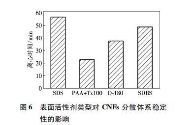 (1)UV-vis测试和Zeta电位测试结果表明,4种表面活性剂中,SDS对CNFs的分散性最好,SDBS次之,而D-180好于PAA复合Tx100.