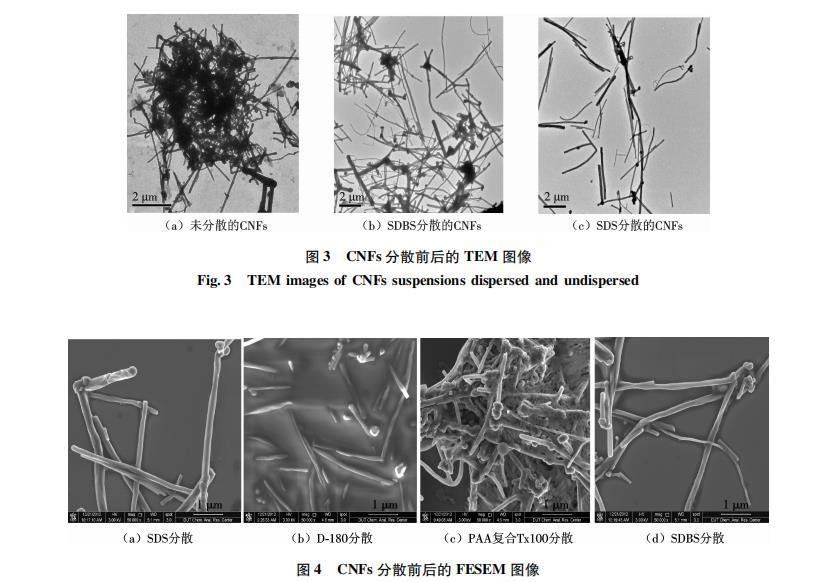 (2)TEM下观察SDS与SDBS分散的CNFs悬浮液,可以看到CNFs缠结现象明显得到改善,可观察到单根CNF存在,SDS对CNFs的分散效果强于SDBS.