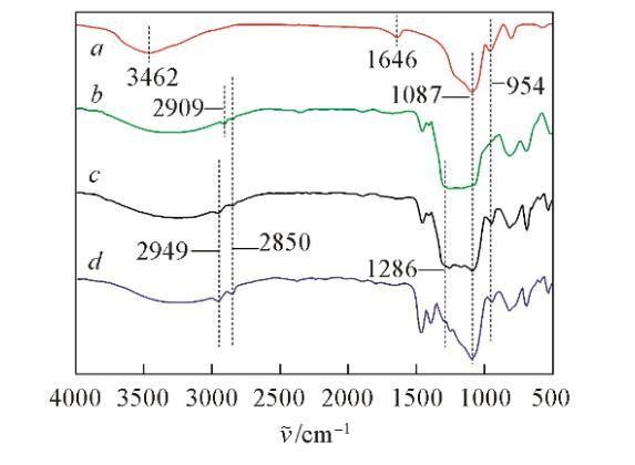 图2为SiO₂颗粒改性前后的红外光谱图。在裸露的SiO₂颗粒(图2谱线a)上,3459 cm⁻¹处出现羟基的氢氧键伸缩振动吸收峰,1646 cm⁻¹处是纳米SiO₂表面吸附水的氢氧键振动吸收峰,而在改性的颗粒上这2处吸收峰强度有所降低甚至消失,这是由于SiO₂颗粒表面的硅羟基(Si—OH)与硅烷偶联剂发生缩合反应而数量减少,并且改变了颗粒表面与水之间氢键的键合密度;在图2谱线b~d中,2949处和2850 cm⁻¹处的吸收峰可分别归属为甲基和亚甲基上的碳氢键伸缩振动;并且这些吸收峰强度增加,说明甲基和亚甲基数量增加。在1170~1286 cm⁻¹间的峰为—CF₃、—CF₂的伸缩振动峰,由于—CF₃、—CF₂的伸缩振动峰与1087~1200 cm⁻¹间的硅氧键伸缩振动吸收峰重合,从而导致图2谱线b~d中1087~1286 cm⁻¹间的吸收峰变宽,并且吸收峰强度依次减弱,说明—CF₃、—CF₂数量减少。综上所述,可初步说明纳米SiO₂表面被不同比例的碳氢链和氟碳链覆盖。