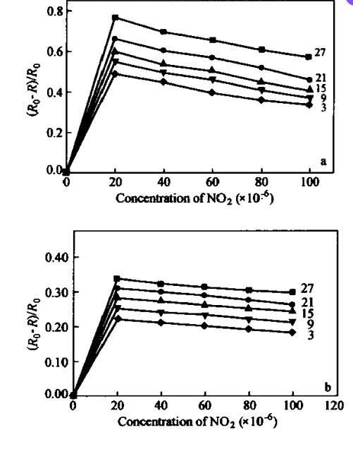 LB膜越薄,与气体的接触越充分,被氧化的程度也越高,因而对气体的响应也就越快。同层的PAN/NMP LB膜较PAN-AA/NMP LB膜具有更快的响应。3层聚苯胺LB膜对相对百分比为20×10⁻⁶NO₂的响应时间为10 s,但是当层数增加到27层时,响应时间就上升到90 s。而对于27层的聚苯胺与乙酸的混合LB膜,响应时间就更长,接近3 min。另一方面,响应时间还随NO₂气体浓度的增加而增长。图5反映了15层聚苯胺LB膜的响应时间与气体浓度变化之间的关系。在相同气体浓度下,PAN/NMP LB膜较PAN-AA/NMP LB膜具有更快的响应和更好的灵敏度。PAN/NMP LB膜对相对百分比为20×10⁻⁶NO₂的响应时间为30 s,而PAN-AA/NMP LB膜则为50 s。当气体浓度增大到相对百分比为100×10⁻⁶时,响应时间分别变化到150 s和180 s。