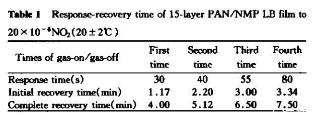 在恢复的初期,吸附在敏感膜表面上的NO₂气体分子将发生较快的脱附;而在随后直至完全恢复的这段较长的时间里,扩散进敏感膜体内的NO₂分子将发生非常复杂的脱附过程:在LB膜和NO₂气体之间的吸附与脱附作用是一个动态过程,脱附的NO₂分子又有可能吸附于LB膜表面或扩散进膜内部,尤其随着通气与排气的次数增加,这种情况就更加复杂。