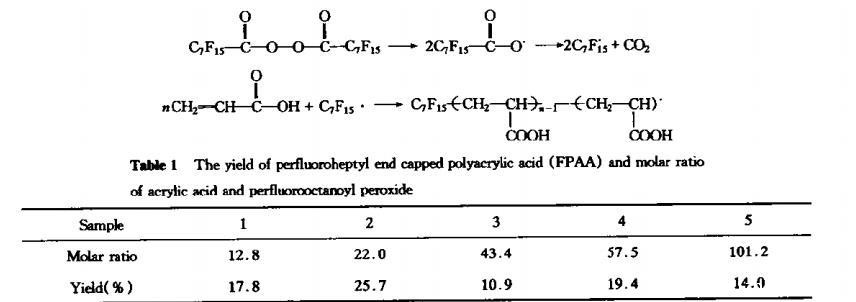 聚合反应是在溶剂CF_{2}CICF CI_{2}中进行的,大自由基将进行链转移,单基或双基终止反应,从而得出产物。反应步骤为在-17℃温度下将50mL含有预定摩尔的全氟庚双酰过氧化物的CF₂CICFCI₂溶液加入有氮气保护装置的反应器中,搅拌下加入已精制过的丙烯酸(密度1.0511g/mL),加热并恒温在45℃下反应10h,产物通过甲醇-乙酸乙酯溶剂体系重结晶并置真空烘箱中干燥,称重并计算产率(如表1)。