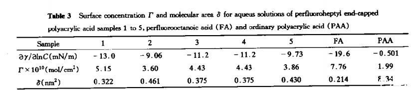 由表3可见,聚丙烯酸(分子量2.5x10⁵)在水溶液中界面活性极低(数据引自文献),每个PAA分子对空气-水界面的覆盖十分松散,全氟庚酸分子所占约0.21nm²,接近全氟烷烃紧密排列的分子轴截面积,而FPAA每个分子所占据的表面面积在0.32~0.46nm²之间,形成尾形链构象的刷状结构。全氟端基的引入,显著改变了PAA分子在界面的构象,由于全氟烃的憎水特性,在水溶液中趋于向水空气界面的吸附,从而极大的提高了界面活性,降低了界面能。