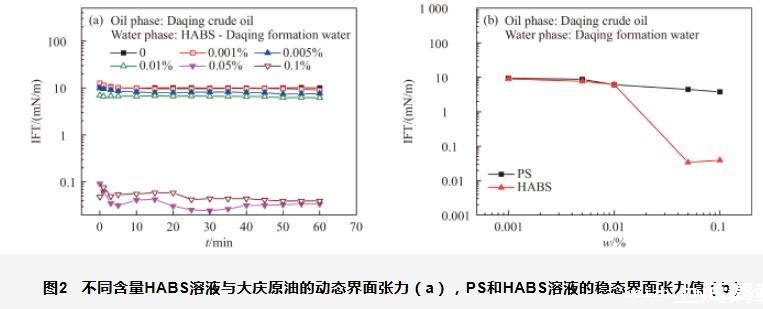 图2不同含量HABS溶液与大庆原油的动态界面张力(a),PS和HABS溶液的稳态界面张力值(b)