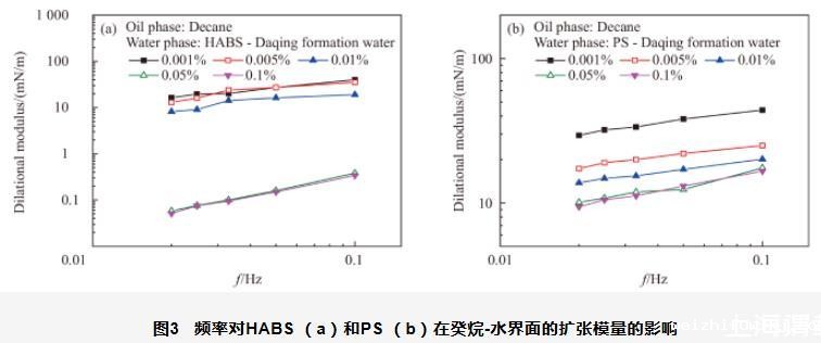 图3频率对HABS(a)和PS(b)在癸烷-水界面的扩张模量的影响