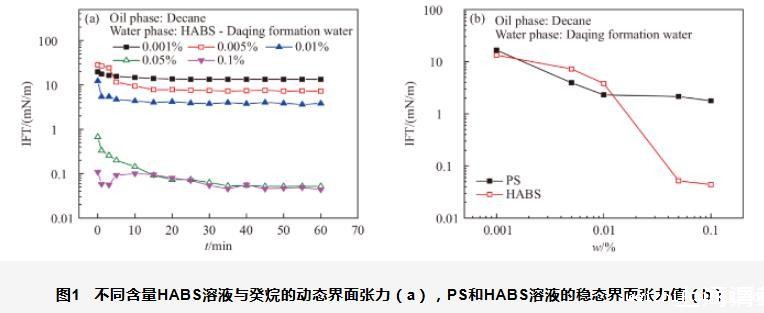 图1不同含量HABS溶液与癸烷的动态界面张力(a),PS和HABS溶液的稳态界面张力值(b)