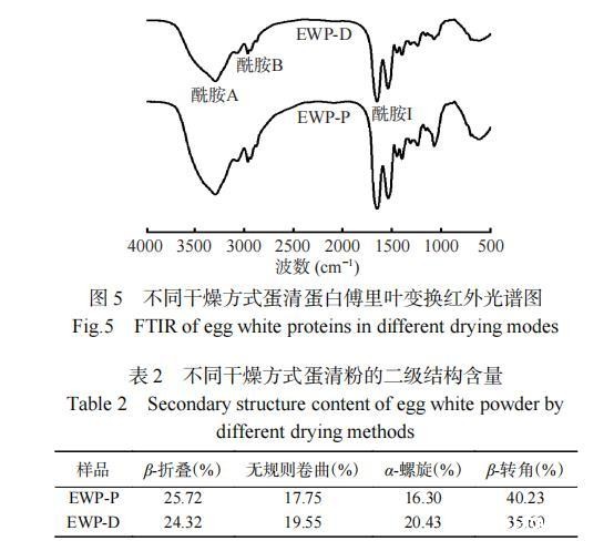 不同干燥方式蛋清蛋白的红外光谱如图5所示。EWP-P和EWP-D在酰胺A带(3700~3200 cm−1)处有强吸收峰,EWP-P的峰强大于EWP-D,表明干燥方式会影响蛋清蛋白的水合能力,这可能与蛋白质分子中N-H键舒展并与氢键形成了缔合体,或蛋白质分子与葡萄糖以共价键结合有关。酰胺B带(2961.64 cm−1)的弱吸收峰主要由C-N键产生。酰胺I带(1600~1700 cm−1)信号主要由C-O键伸缩振动引起,与蛋白质的二级结构有关,涉及β-折叠(1600~1640 cm−1)、无规则卷曲(1640~1650 cm−1)、α-螺旋(1650~1660 cm−1)和β-转角(1660~1700 cm−1)。采用Peak fit软件对不同干燥方式蛋清蛋白的酰胺I带峰强进行高斯曲线拟合分析,根据峰面积计算其二级结构的相对百分含量,结果如表2。EWP-P和EWP-D的二级结构以β-折叠和β-转角为主,EWP-P的β-折叠含量增加主要与卵转铁蛋白热变性有关,同时分子间的β-折叠结构也易转变为β-转角结构。而α-螺旋下降可能是因为热变性导致α-螺旋中的氢键断裂,进而发生了解螺旋现象。EWP-P无规则卷曲增加,表明其部分有序结构向无规则卷曲转化,蛋白变性明显,结构的随机性增强。