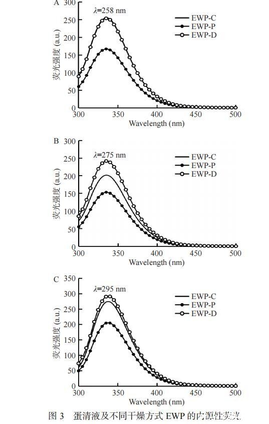 蛋白质的固有荧光来自于内部的芳香族氨基残基(酪氨酸Tyr、色氨酸Trp、苯丙氨酸Phe),其荧光最大值(λmax)、强度对其微环境的极性极其敏感,因此可用来表征蛋白质的三级结构变化,其中Trp、Tyr和Phe的特有荧光激发波长分别为295、275和258 nm。如图3所示,与EWP-C相比,不同干燥方式制备的蛋清粉的固有荧光强度降低但荧光峰的位置未有明显的迁移。EWP-P的荧光强度低于EWP-D于EWP-C,可能是因为喷雾干燥的干燥温度高,蛋清蛋白变性程度大,芳香族氨基酸残基暴露于更极性环境中,进而发生了荧光猝灭现象。此外,EWP-P的荧光强度较低还可能是由于蛋清蛋白中含有葡萄糖,在高温下会与蛋白质发生美拉德反应,屏蔽了芳香族氨基残基。