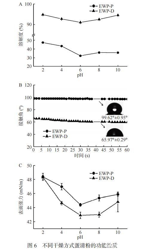 溶解性是蛋白重要的功能特性之一,与接触角、表面张力、乳化性等密切相关。如图6A,不同pH下不同干燥方式的蛋清粉溶解度的测量。EWP-P的溶解度随着pH的升高先减小后增大,这可能是因为在酸性和碱性环境中球状蛋白质会发生部分展开,形成熔融球状构象,变得更加灵活,更容易与水分子作用。pH为6.0时蛋清蛋白的溶解度最低,可能是因为该pH与蛋清蛋白中大部分蛋白的等电点相近,蛋白带电荷量较少,因此容易发生沉淀。与EWP-P相比,EWP-D在pH6.0时溶解度的下降程度较小,这可能与真空冷冻干燥后蛋清蛋白的微观结构呈片状,具有较大的比表面积有关,也可能是因为冷冻干燥蛋白质在脱水过程中蛋白质变性低,促进了可溶性聚集物生成。EWP-D的溶解度远大于EWP-P,这是因为喷雾干燥是直接将蛋清液雾化后再干燥,其蛋清粉表面会形成一个光滑、抗湿性的薄膜,最终导致蛋白的溶解性降低,复水性差且易结块。而真空冷冻干燥经过冷冻升华,可保持食品原有的形状故具有很好的速溶性和复水性。Shaviklo等也发现喷雾干燥的含添加剂(花粉)蛋白的蛋白质溶解度明显低于冻干蛋白。