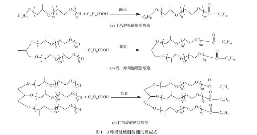 称取一定质量的聚醚包括不同脂肪醇聚醚、丙二醇聚醚和甘油聚醚,同不同脂肪酸置于500 mL的反应烧瓶内,搅拌,升温,当温度上升至80℃时,加入0.2%(相对于体系总质量)的对甲苯磺酸作为催化剂,改变体系状态为真空,压力在−0.095 MPa以下。继续升温至140℃,保温4 h,然后降温至60℃,加入NaHCO₃中和催化剂,继续搅拌降温至室温,得到聚醚脂肪酸酯(以下简称聚醚酯)消泡剂。以硬脂酸为例合成的不同聚醚酯如图1所示。