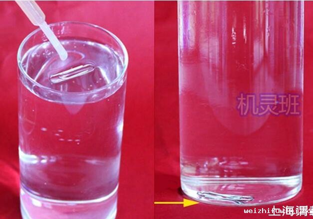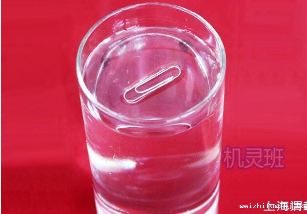 1、将回形针放入一杯水中,回形针会下沉至玻璃杯的底部!