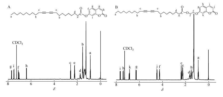 2类香豆素取代二乙炔单体参照文献所述方法合成,分子结构及产物核磁谱图如图1所示。将2种产物分别溶于氯仿,配成1mg/mL的溶液。亚相为超纯水(18.2MΩ·cm)。所有的π-A曲线和LB膜拉制实验均为20℃条件下在KSV Mini-trough LB膜仪上进行。溶剂充分挥发后,膜障以5 mm/min的速率对其压缩,在20℃和恒定膜压35 mN/m下以2mm/min速率沉积Y-型LB膜。基片为石英片。薄膜的聚合是在16W的紫外灯(波长254nm)辐照下完成的,薄膜表面距离灯管下缘10cm,辐照时间5min。