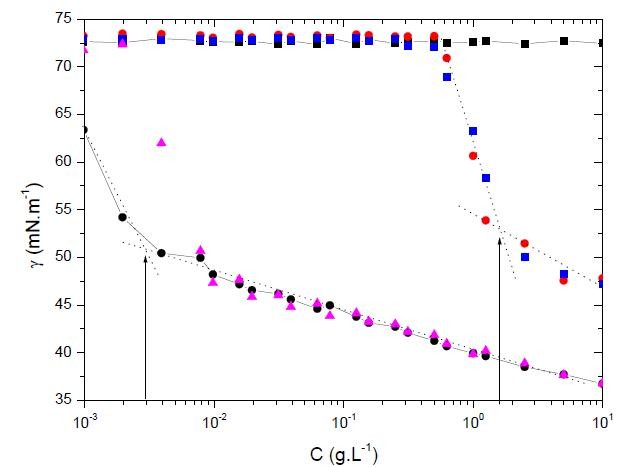 微流控技术是一种利用微米尺度管道及其它辅助手段对纳升、皮升级流体单元进行主、被动操纵的新兴技术。近年来,Karakasyan研究团队应用微液滴微流控技术制备出单分散响应型的聚醚胺-海藻酸盐共聚的微凝胶(Colloids and Surfaces B:Biointerfaces,2015,135,619–629),聚醚胺(PEA)与环氧丙烷/环氧乙烷(29/6)通过两种分子之间的胺键相连接枝共聚得到海藻酸盐接枝型的微凝胶。液滴微流控技术为海藻酸盐接枝微凝胶提供了精准的尺寸和物理化学性质控制,使得这些微凝胶与单独的海藻酸接枝链比,仍然保持有两亲型和热敏性等性质,应用表面张力测试技术研究微凝胶的表面化学性质,通过使用Delta-8高通量表面张力分析仪,采用Du Nouy-Padday法(最大拉力法)测试了不同浓度比例的组成聚醚胺-海藻酸盐共聚物化合物的表面张力,并自动将表面张力记录到系统中,由于Delta-8高通量表面18luck国际能够一次性测试96个样品,软件对测试的样品的数据能够进行自动分析,从而获得了聚醚胺-海藻酸盐共聚物的临界聚集浓度(CAC)以及临界胶束浓度(CMC)。(如下图1所示)。