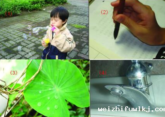 细心观察莲花、芋头叶及甘蓝菜的叶面,我们发现水珠可以在这些叶面上自由的滚动。自来水笔的墨水不会因地心引力而滴出、毛笔上的墨汁不会掉下来。水滴在水龙头下会慢慢形成一个球状的液滴再滴下来,肥皂泡泡吹出来不会破。这些现象都是和表面张力有关。水珠能在荷叶上自由的滚动,这是因为水在叶面上的接触角介于130~160度之间,接触角大显示出水珠不易润湿表面。而自来水笔的墨水不会滴出来以及毛笔的墨汁不会掉下来是因为液体的毛细管现象。因为毛细管的水与管壁的接触角小于90度,表示水与管壁的附着力较水分子间的内聚力大,由于附着力与表面张力的相互作用,一垂直毛细管端的液滴会被吸住,并和重力达到平衡,这就是自来水笔的墨水不会因地心引力而滴出的原因。而便宜的原子笔往往因表面张力的控制不良而不顺畅或油墨溢出。毛笔上的墨汁不会掉下来也是毛细现象的关系。