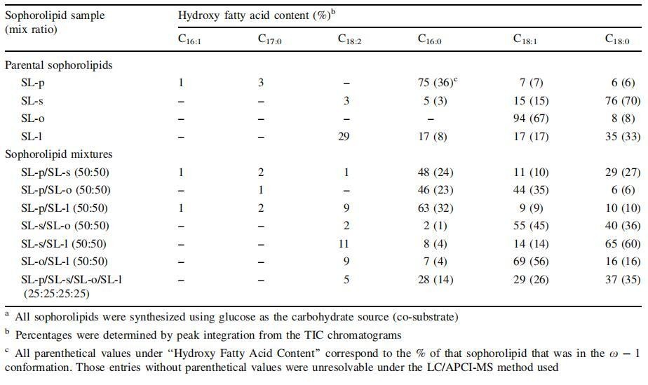 表1:通过LC/APCI MSa测定的由C.bombicola从棕榈酸(SL-p)、硬脂酸(SL-s)、油酸(SL-o)、亚油酸(SL-l)酸生产的槐脂的结构含量(开链与内酯)
