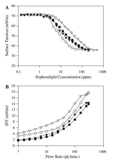 测试表面活性性质,以确定每种SL对水溶性、最小ST、CMC和IFT的影响。 我们发现SL-p和SL-l的水溶性均大于200mg/l,而SL-s和SL-o的水溶性均小于200mg/l。 图4显示了SL浓度对水表面张力的影响(图4a)和流速对IFT的影响(图4b)。