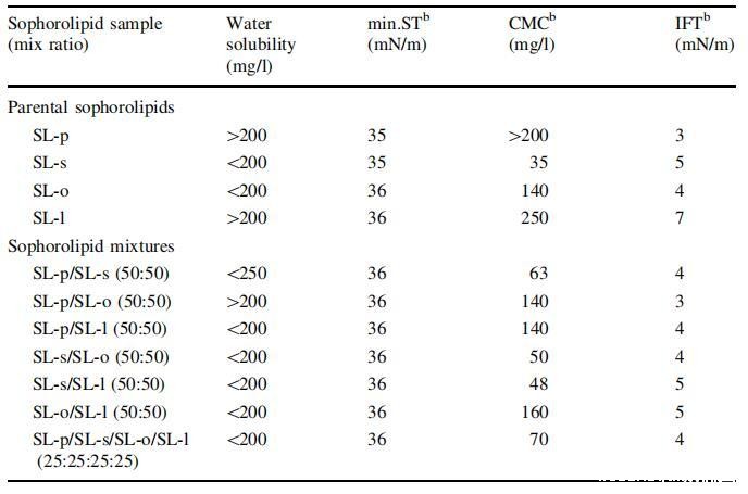 4个亲代SLs中的每一个都产生了35–36 mN/m的可比最小ST,但CMC值明显不同(表3)。 SL-p和SL-l的CMC值均大于200 mg/l,而SL-s和SL-o的CMC值分别为35 mg/l和140 mg/l。 IFT值范围为3 mN/m(SL-p)至7 mN/m(SL-l)。 为了控制SLs的表面活性,以50:50的混合比制备混合物,并重新评估其性能。 各混合物的内酯分布见表2。 经分析,最小ST和IFT相对不变,但CMC值确实因SL混合物而异。 通过混合获得了介于48 mg/l和140 mg/l之间的临界胶束浓度。 有趣的是,CMC值最低的SL混合物都含有SL-s成分。 特别是SL-s的CMC值为35 mg/l; 即使是以25:25:25:25的比例包含所有4种亲本SL的混合物,其CMC值(70 mg/l)也比不含SL-s成分的其他混合物低。 这些数据表明,SL-s对水的表面活性性能的影响更为显着。 通过使用较少的SL-s,可以实现相等的最小ST和IFT。 性能控制和高产量将通过降低成本最终有助于SLs的工业应用。 这些数据还指出,通过将不同的SLs混合在一起以获得所需的性质,可以在一定程度上控制SLs的表面活性性质。 虽然未达到表明这些SLs单独具有优越表面活性剂性能的最低标准,但其性能可能足以允许其作为石化表面活性剂添加剂的使用量增加,以便在大量使用表面活性剂的应用中尽量减少不利的环境影响。 SL-p和SL-l的CMC值均大于200 mg/l,而SL-s和SL-o的CMC值分别为35 mg/l和140 mg/l。IFT值范围为3 mN/m(SL-p)至7 mN/m(SL-l)。为了控制SLs的表面活性,以50:50的混合比制备混合物,并重新评估其性能。各混合物的内酯分布见表2。经分析,最小ST和IFT相对不变,但CMC值确实因SL混合物而异。通过混合获得了介于48 mg/l和140 mg/l之间的临界胶束浓度。有趣的是,CMC值最低的SL混合物都含有SL-s成分。特别是SL-s的CMC值为35 mg/l;通过将SL-s与SL-p、SL-o和SL-l以50:50的比例混合,CMC值分别增加到63 mg/l、50 mg/l和48 mg/l。即使是以25:25:25:25的比例包含所有4种亲本SL的混合物,其CMC值(70 mg/l)也比不含SL-s成分的其他混合物低。这些数据表明,SL-s对水的表面活性性能的影响更为显著。通过使用较少的SL-s,可以实现相等的最小ST和IFT。性能控制和高产量将通过降低成本最终有助于SLs的工业应用。这些数据还指出,通过将不同的SLs混合在一起以获得所需的性质,可以在一定程度上控制SLs的表面活性性质。虽然未达到表明这些SLs单独具有优越表面活性剂性能的最低标准,但其性能可能足以允许其作为石化表面活性剂添加剂的使用量增加,以便在大量使用表面活性剂的应用中尽量减少不利的环境影响。