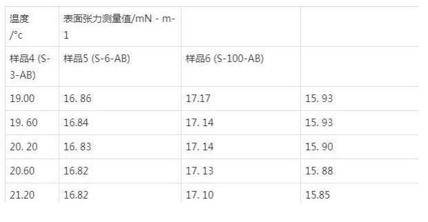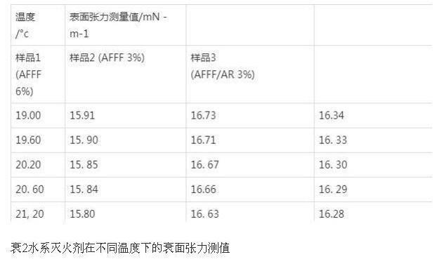 温度条件对于液体表面张力存在着很大的影响。大量试验数据表明,液体的表面张力会随着温度的升高而降低。通过对一系列流体灭火剂产品,包括不同配比的泡沫灭火剂(成膜型)、水系灭火剂等样品进行测试,可以清晰地从表1、表2中看出,温度的变化对流体型灭火剤的表面张力存在一定程度的影响。