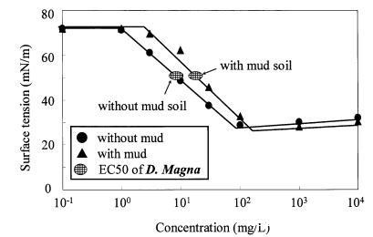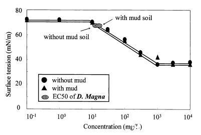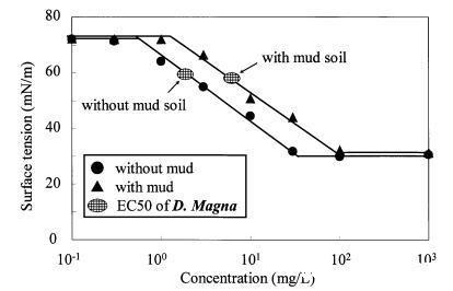 图11泥质土壤存在对LAS表面张力曲线和大型水蚤有毒表面张力值的影响。
