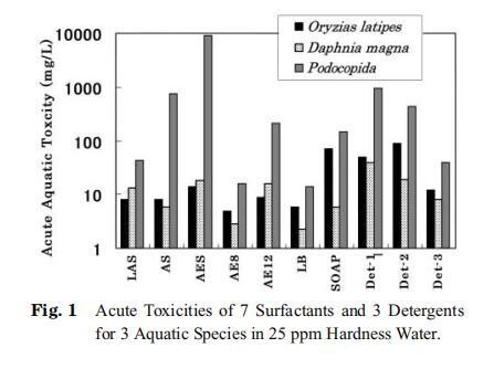 使用3种测试生物:米齐亚属latipes、大型水蚤(daphnia magna)和podocopida,测定了7种表面活性剂和3种商用洗涤剂的急性毒性。 结果如图1所示。 在所有情况下,足爪螨的EC50和/或LC50均高于宽脊稻和大型水蚤。 肥皂和LB对稻瘟病菌的毒力值高于对大型水蚤的毒力值,而其他5种表面活性剂对稻瘟病菌和大型水蚤的毒力值几乎相等。 表面活性剂可分为3类; 低毒组(AES、SOAP和AE12)、中毒组(LAS和AS)和高毒组(AE8和LB)。