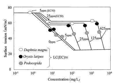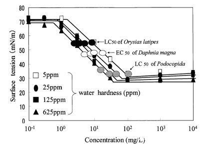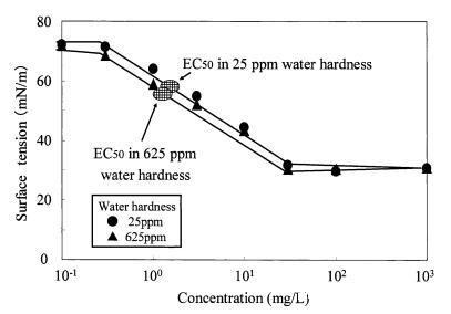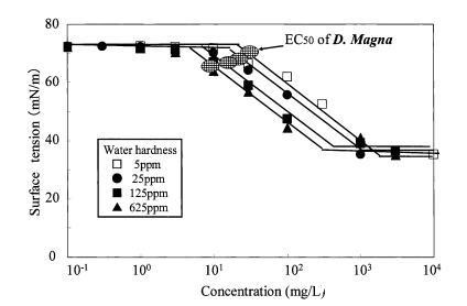 图9水硬度对烷基硫酸盐表面张力曲线的影响以及对大型水蚤的有毒表面张力值。