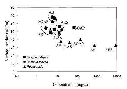 图2显示了五种不同表面活性剂(LAS、AE8、AES、AS和SOAP)的γtox和水生毒性值之间的关系。 野生稻的γtox值与大型水蚤相近。 LAS、AE8、AES-AS和SOAP的γtox值分别为50、50、50、65-70和60mn/m。 另一方面,所有五种表面活性剂的podocopida的γtox值均低于40 mN/m。